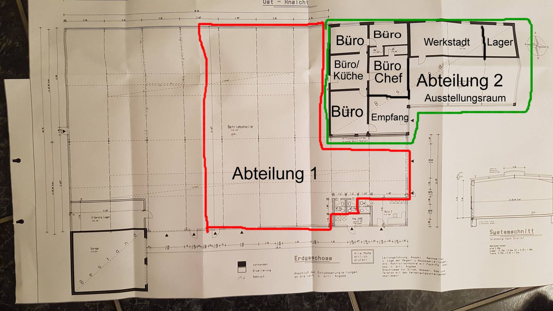 Die Halle ist mit Fußbodenheizung ausgestattet, wobei man auf 10 verschiedenen Flächen die Temperaturen einstellen kann. Sparsamer Energieverbrauch. Beide WC auch mit Fußbodenheizung. Das Hallentor zur Umgehungsstraße hat eine Öffnung von 4,50m x 4,50m