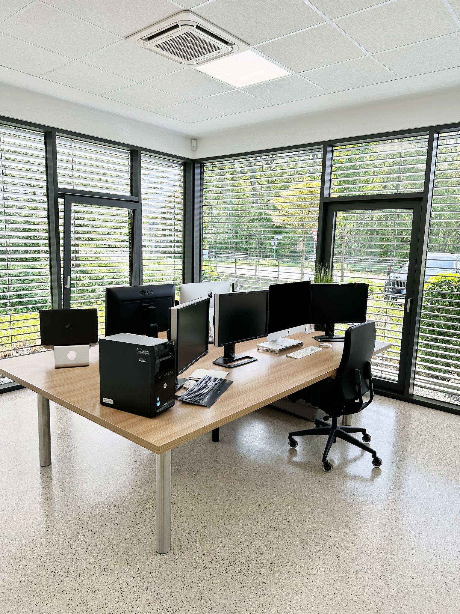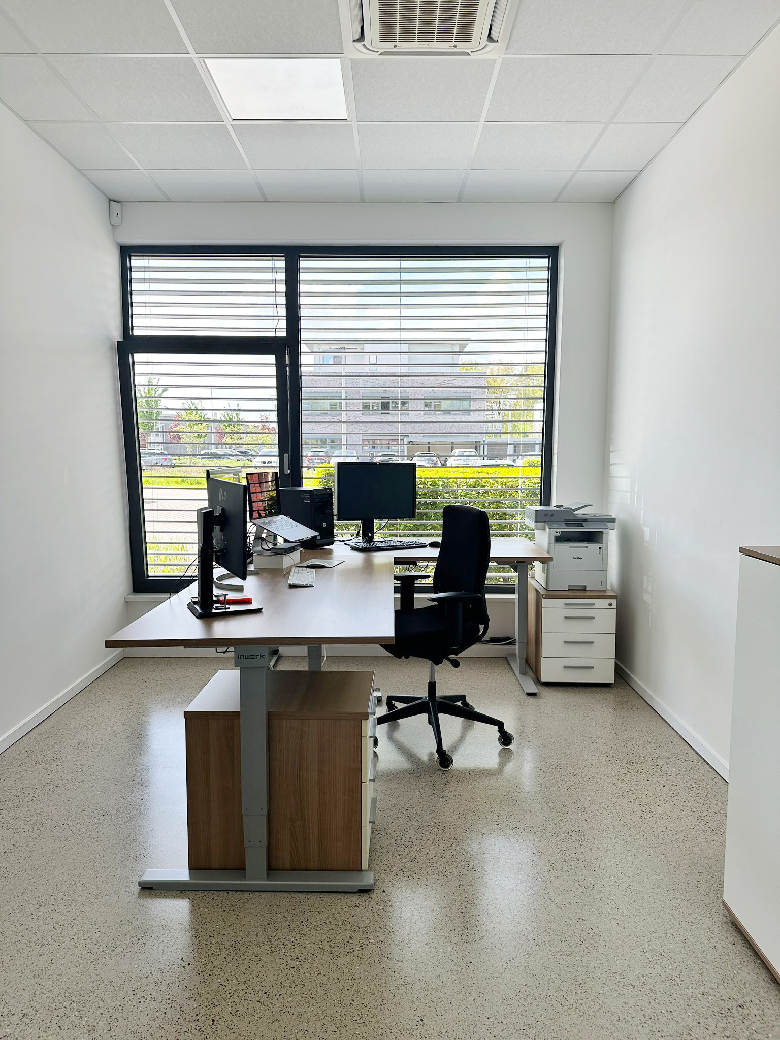 Dezentes und modernes Interior, ergonomische Arbeitsplätze mit höhenverstellbaren Schreibtischen und ergonomischer Bürostühle.