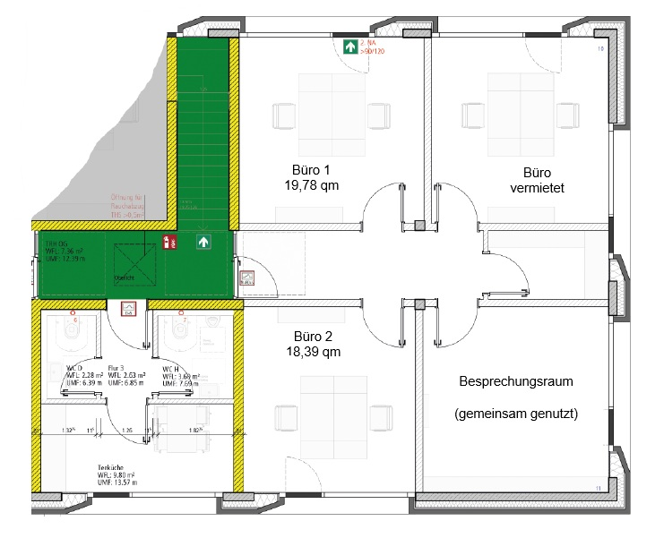 18,39 qm, 440€ netto (inkl. Nutzung Besprechungsraum, Gemeinschaftsflächen etc.)