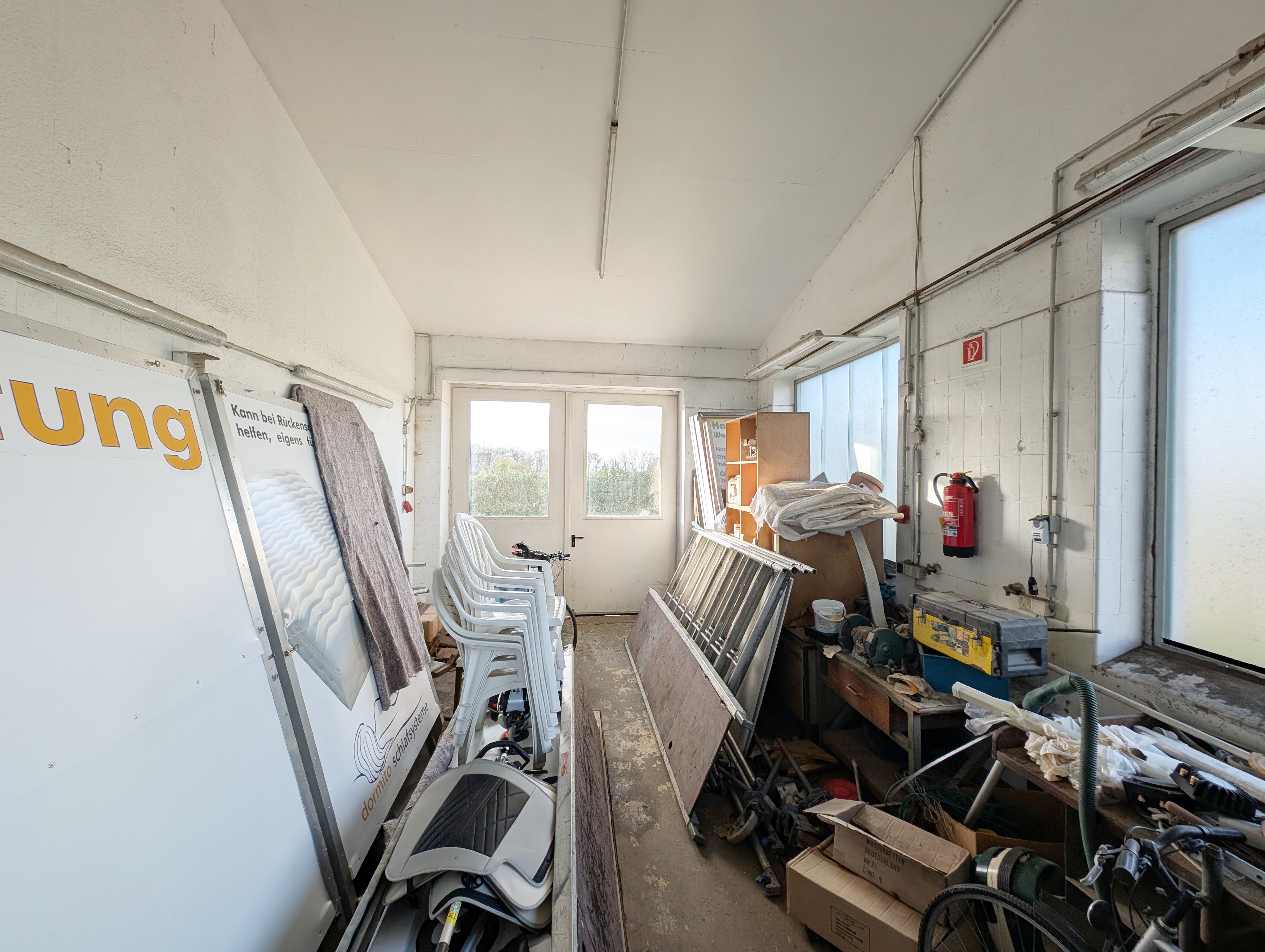 Große Halle: ca. 500 m², zwei Rolltore, rundum Verglasung, renoviert 2010 + 2024, Dach neu 2024